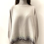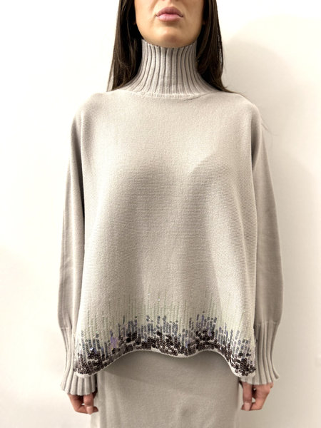Dolcevita dalla linea ampia con paillettes sul fondo. Polsini e collo lavorato a coste. Colore: Ghiaccio