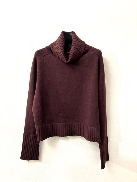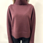 Dolcevita dalla linea ampia, collo, bordo e polsini lavorati a coste. Colore: Borgogna