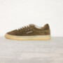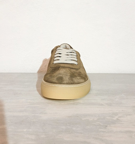 Sneakers in camoscio taupe, punta tonda e chiusura con lacci