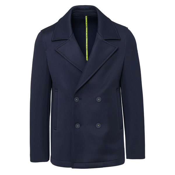 Peacoat sfoderato, chiusura con bottoni, due tasche frontali, logo su manica, finiture con impunture. Scuba tecnico accoppiato stretch