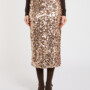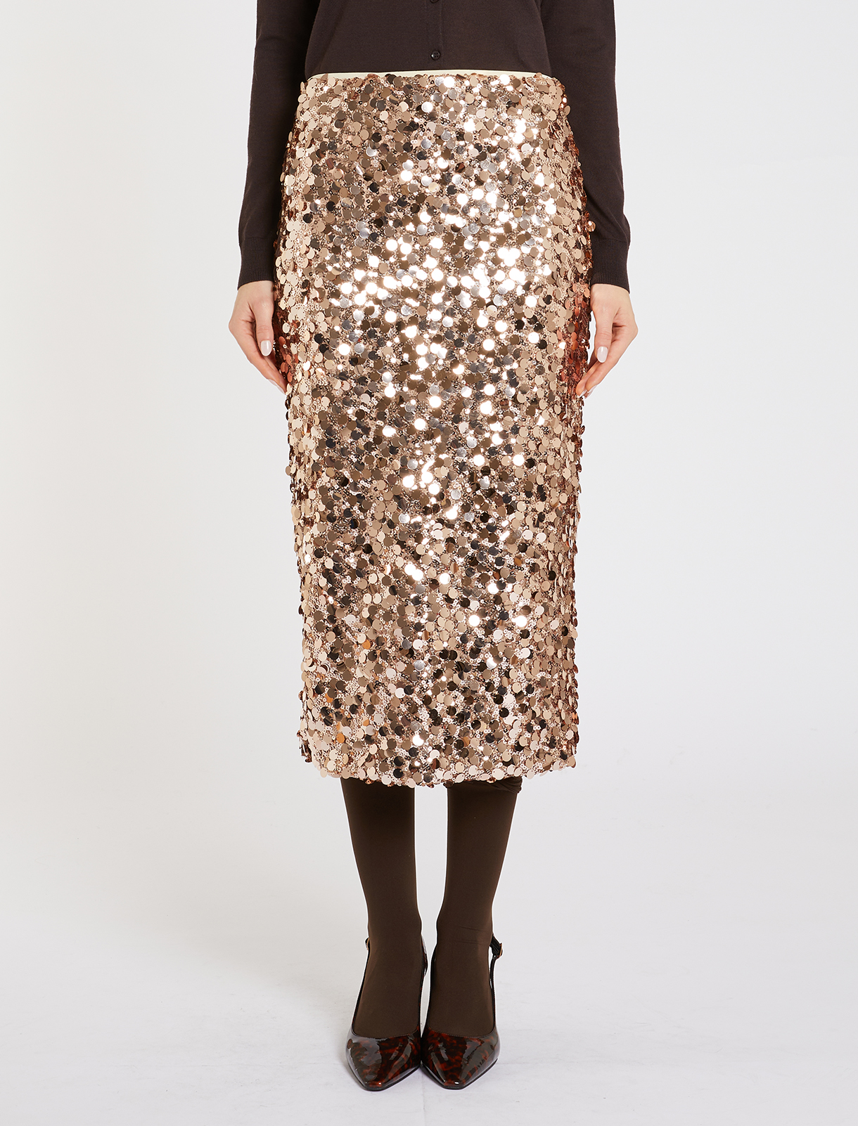Gonna in jersey tulle con paillettes , linea pencil con pinces dietro, chiusura con elastico in vita.