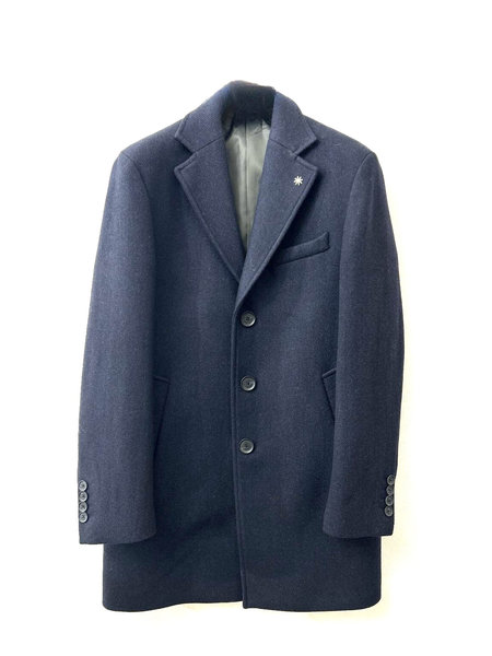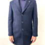 Cappotto lungo blu, chiusura tre bottoni, due tasche a pistagna e un taschino frontali, spacco centrale sul retro.