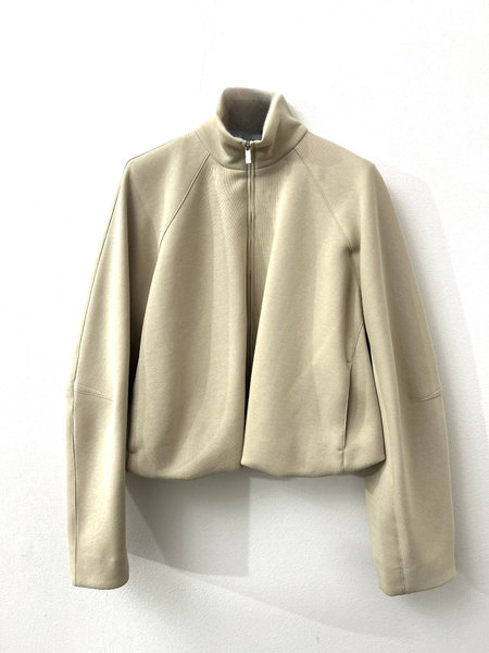 Felpa crop in jersey di cotone doppio spessorato. Volume over, collo alto e maniche raglan ampie. Bordo arricciato e chiusura frontale zip.