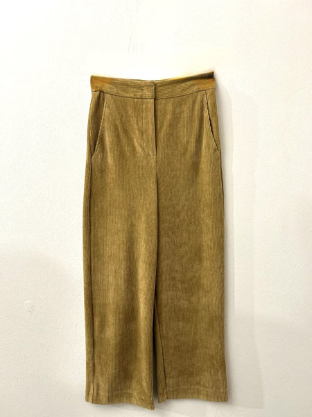 Pantalone in velluto di cotone a coste con vita regolabile, elasticizzato sul retro. Chiusura con listino alto in vita, zip con patta e gancetto. Tasche alla francese sui fianchi. Tasche con patta e bottone sul retro. Piega stirata sulla gamba.