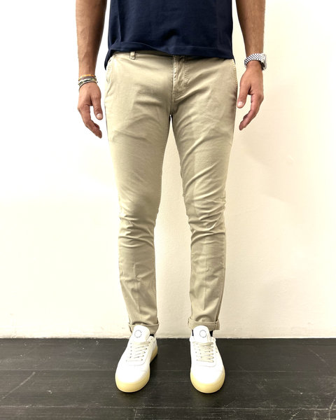 Pantaloni Gaubert slim chino, vita bassa, tasche a filetto posteriori. Punto milano resca. Logo Dondup. Made in Italy