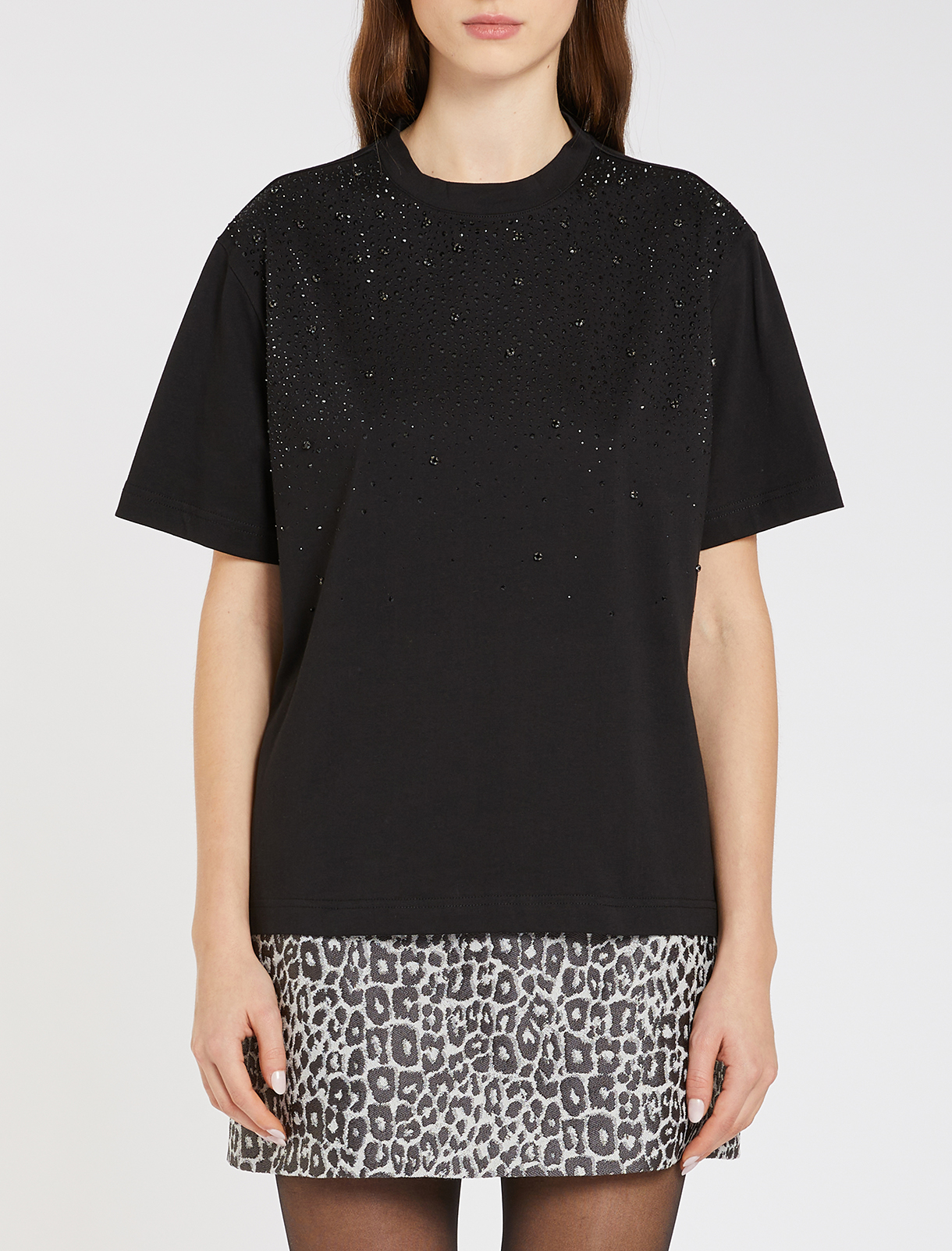 T-shirt in jersey di cotone stampato e ricamato, linea morbida